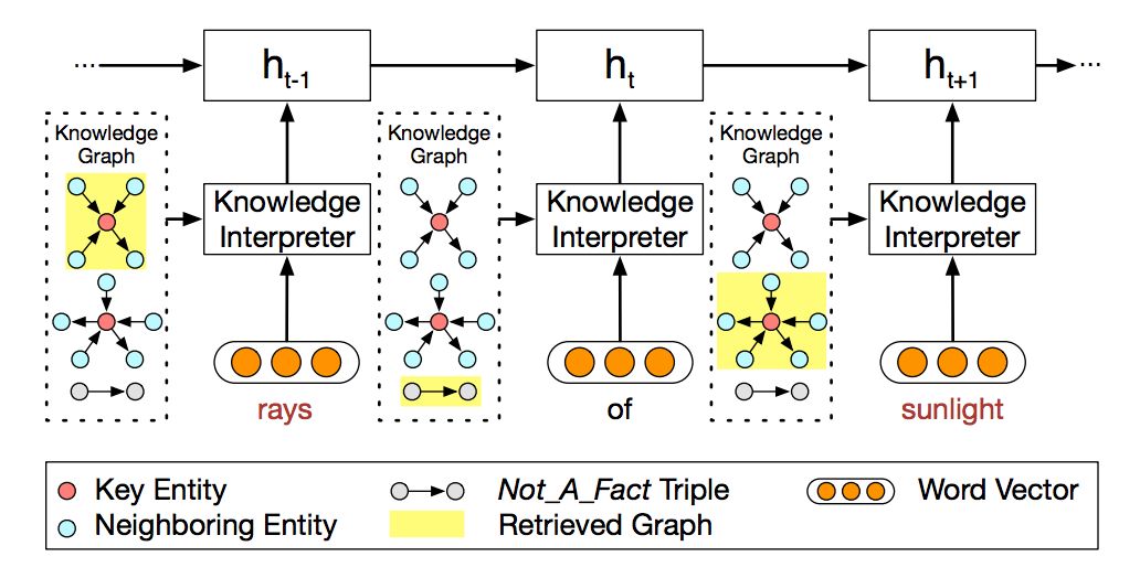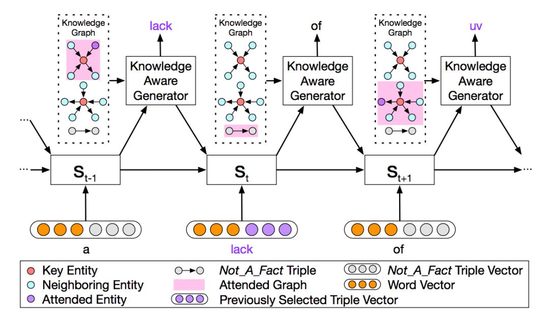 本文提出的方法,利用了大规模的常识性知识图谱。首先是理解用户请求,找到可能相关的知识图谱子图;再利用静态图注意力(static graph attention)机制,结合子图来理解用户请求;最后使用动态图注意力(dynamic graph attention)机制来读取子图,并产生合适的回复。