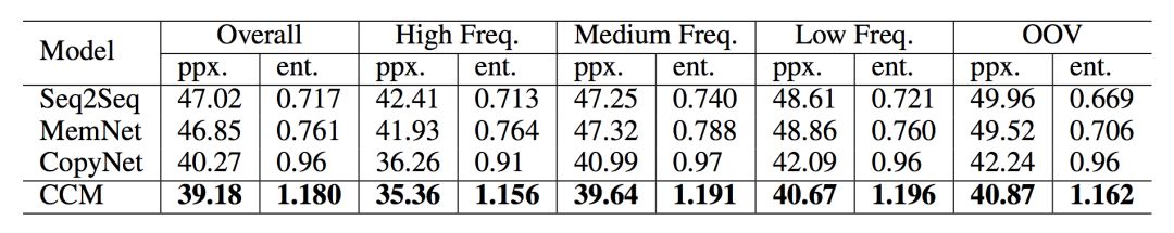 从图 5 中可见,CCM 对于三个基线系统来说,都有将近 60% 的回复是更优的。并且,在 OOV 的数据集上,CCM 比 seq2seq 高出很多,这是由于 CCM 对于这些低频词或未登录词,可以用知识图谱去补全,而 seq2seq 没有这样的知识来源。