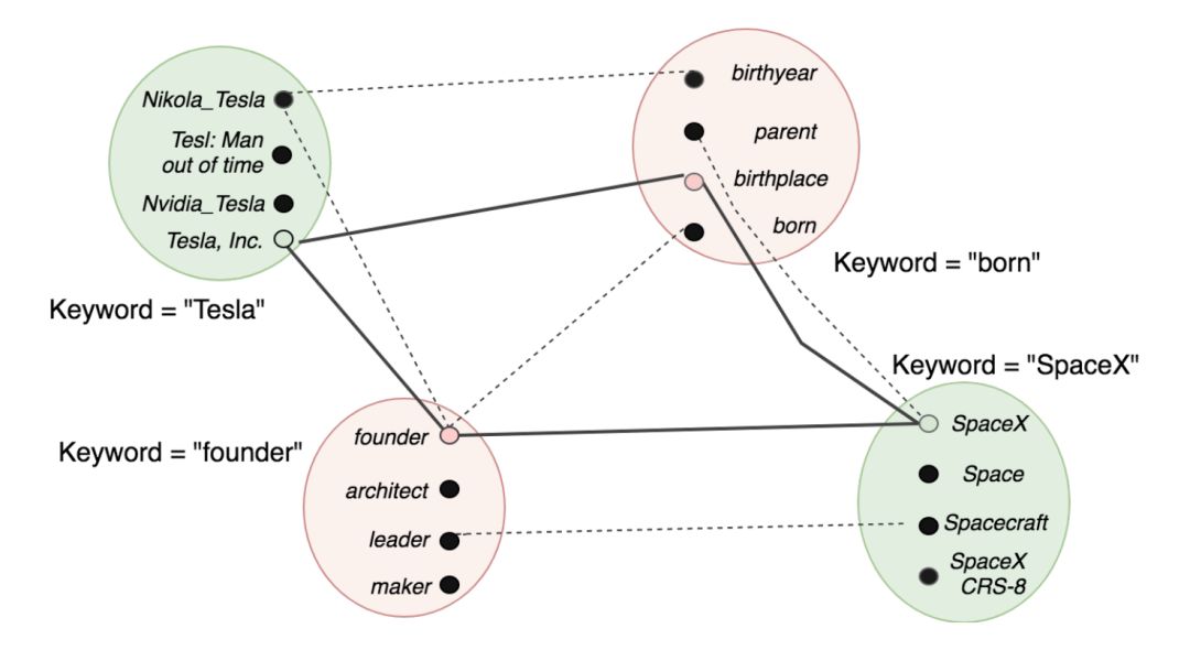1. 利用 SENNA 系统从输入的自然语言问句中抽取出若干关键词短语。对于图中输入的问句,这里抽取到的关键词短语是<founder,Tesla, SpaceX, born>。