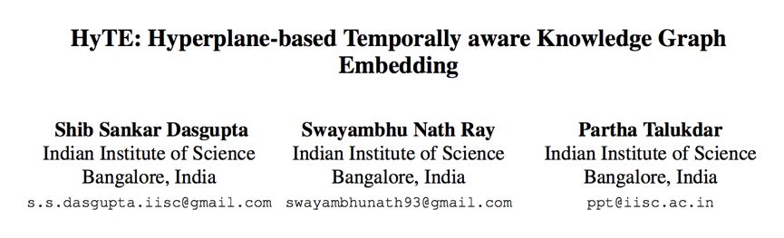这些模型都没有考虑时间维度,一直将知识图谱当做静态来处理,这显然不符合事实。数据的暴涨与更新表明知识图谱本来就是动态的,所以后来有工作将时间信息考虑进去,但只是将时间序列作为 KG embedding 过程中的约束,没有明显地体现时间的特性。为此,本文提出的 HyTE 模型直接在学习的过程中结合时间信息。
