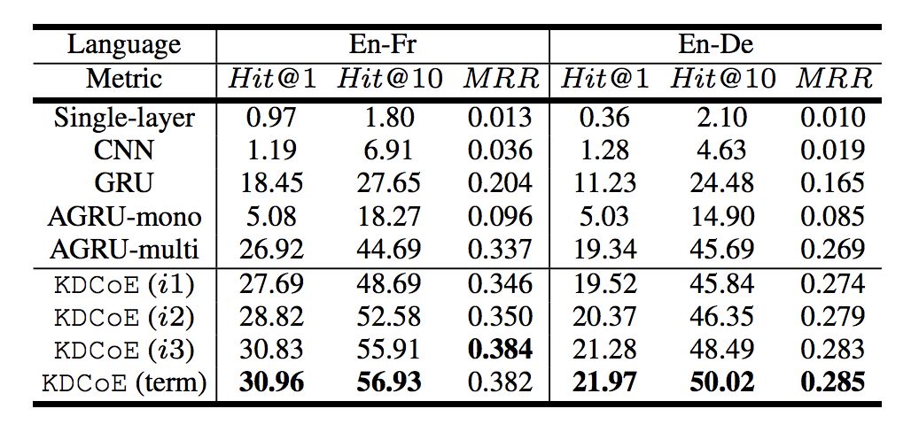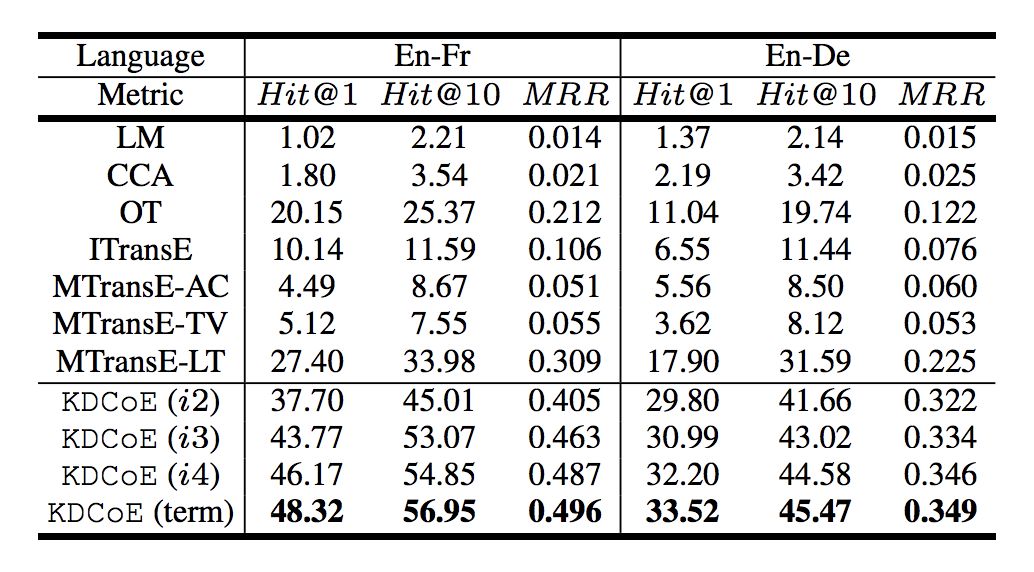 1. 提出了一种半监督学习方法 KDCoE,协同训练了多语知识图谱嵌入和多语实体描述嵌入用于跨语言知识对齐;