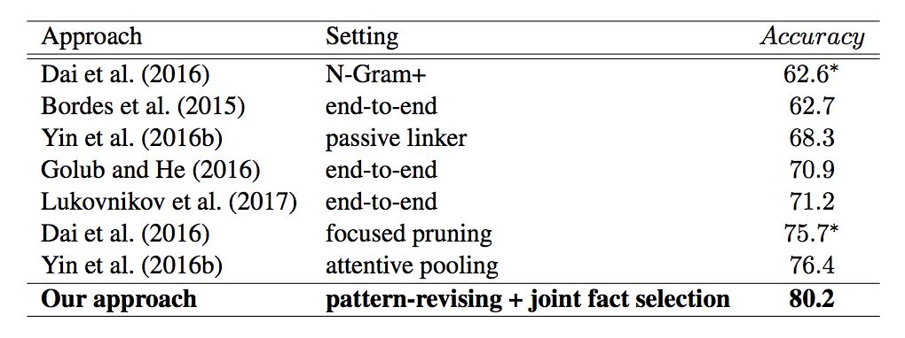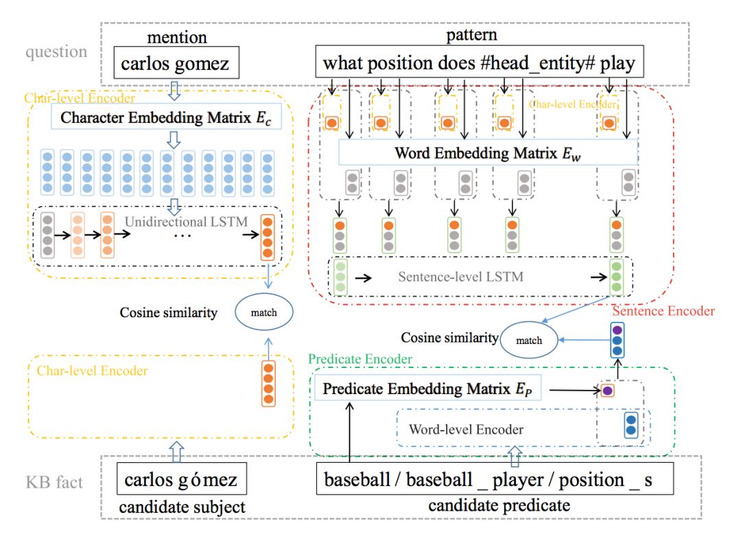 为了学习对“subject-predicate”(问题的实体-谓词)候选集的排序,本文提出将关系检测机制用于强化联合事实选择,多级别编码和多维信息将被用于强化整个模型过程。实验结果表明,本方法展现出非常强大的性能。