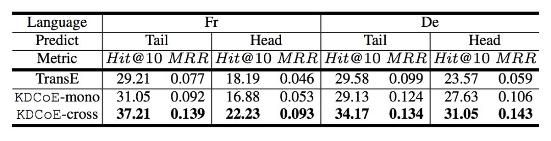 根据 KDCoE-mono 的表现,可以推断,该模型成功继承了 TranE 保持结构化知识中实体和关系的稳定性。而 KDCoE-corss 则反映引入跨语言信息确实对知识补全的效果起到了明显提升。