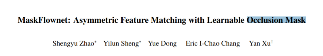特征warping 是光流估计的核心技术之一。然而,warping 过程中被遮挡区域引起的模糊性是一个尚未解决的主要问题。本文提出了一种非对称遮挡感知的特征匹配模块,该模块可以学习一种粗糙遮挡掩模,该掩模在特征warping 后立即过滤无用(遮挡)区域,而不需要任何显式监督。该模块可以很容易地集成到端到端网络架构中,在引入微不足道的计算成本的同时,还可以获得性能提升。学习后的遮挡掩模可以进一步反馈到具有双特征金字塔的后续网络级联中,从而达到最先进的性能。在提交时,我们的方法MaskFlownet超过了MPI Sintel、KITTI 2012和2015基准上所有已发布的光流方法。