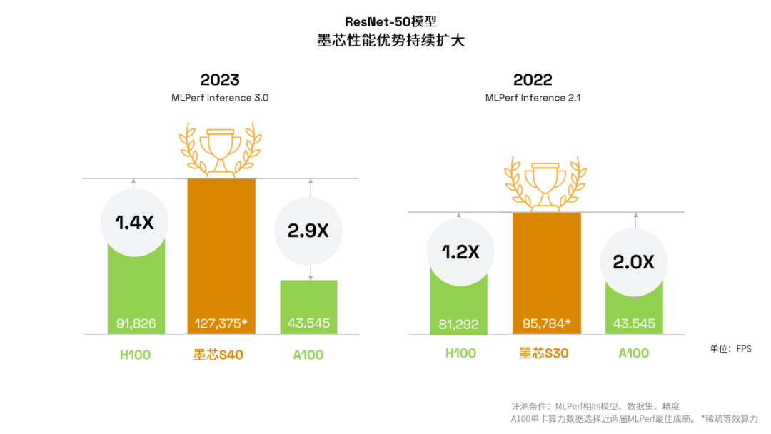 二度问鼎,优势持续扩大:这是墨芯第二次在 ResNet-50 模型上夺冠。墨芯 S40 计算卡比上届冠军 S30 计算卡的算力增幅达 33%,体现出持续的产品性能提升能力。与上一次 MLPerf 相比,墨芯产品相较 H100 和 A100 的算力优势分别扩大了 20% 和 90%。