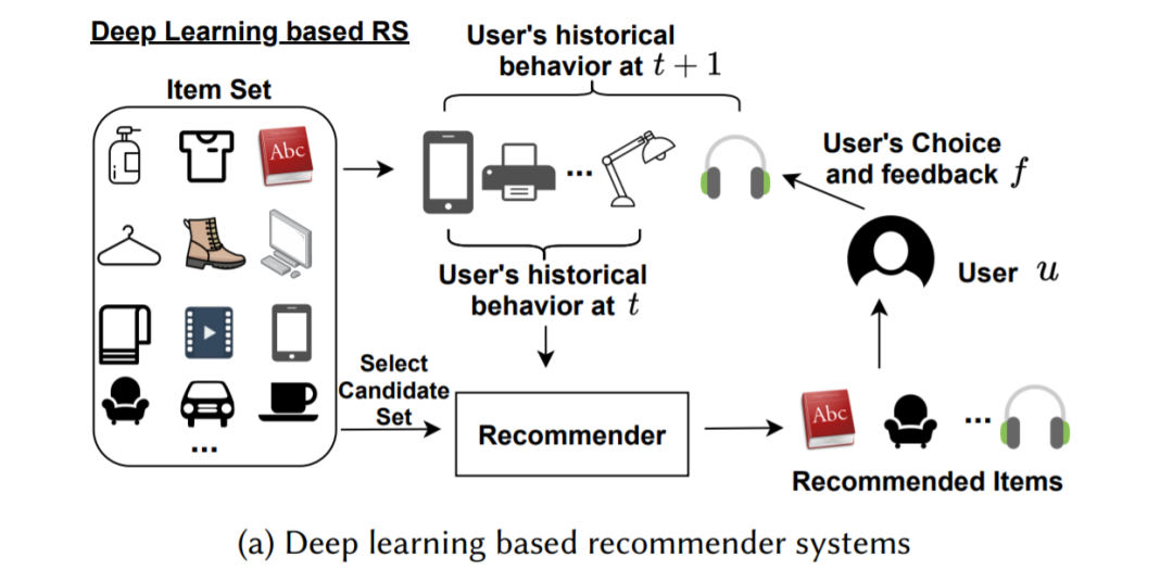 近年来,推荐技术有了长足的发展,从传统的协同过滤、基于内容的推荐、矩阵分解等推荐技术[62],到基于深度学习的推荐技术。特别是深度学习在解决复杂任务和处理复杂数据方面具有很强的优势,因为深度学习能够捕捉非线性的用户-项目关系,能够处理图像、文本等各种类型的数据源。因此,它在推荐系统中得到了越来越多的应用。由于分布的变化,基于深度学习的推荐系统在捕获兴趣动态方面存在局限性[17,115],即训练阶段基于现有的数据集,这可能不能反映真实的用户喜好,而用户的喜好变化很快。而深度强化学习(deep reinforcement learning, DRL)的目标是将深度学习和强化学习的力量结合起来,训练出一种能够从环境提供的交互轨迹中学习的agent。由于DRL中的agent可以主动从用户的实时反馈中学习,从而推断出用户的动态偏好,因此DRL特别适合于从交互中学习,如人-机器人协作; 它还推动了一系列互动应用的显著进步,从视频游戏、Alpha Go到自动驾驶[3]。鉴于DRL对推荐系统的重要性和最近的进展,我们旨在在本次综述中及时总结和评论基于DRL的推荐系统。