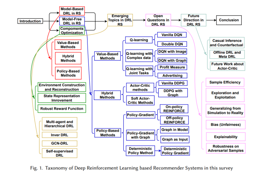 本综述的其余部分组织如下: 第2节概述了推荐系统、DRL及其集成。第3节提供了一个分类和分类机制的文献综述。第4节回顾了出现的话题,第5节指出了未解决的问题。最后,第6节为这一领域的进一步发展提供了一些有前景的未来方向。