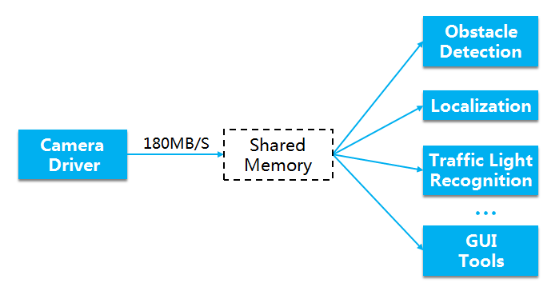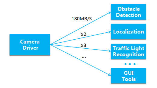 它对于带宽资源是十分敏感的,以摄像头传感器为例,因为自动驾驶要高速行驶,采样率要高,至少每秒30帧, 以1080P的像素计算,大概为 180M/S,而且传感器的数据不只一个节点感兴趣,见下图: