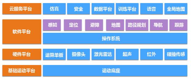 软件平台包括操作系统和上层算法。目前主流的机器人操作系统是ROS,ROS是Willow Garage公司在2010年发布的开源机器人操作系统,由于其具有点对点设计,不依赖于编程语言,分布式架构,强大的硬件抽象,广泛的社区参与贡献,丰富的可复用,知名的开源库资源,已经成为机器人设计的不二选择。对于低速运动场景,原生的ROS环境完全满足设计要求。