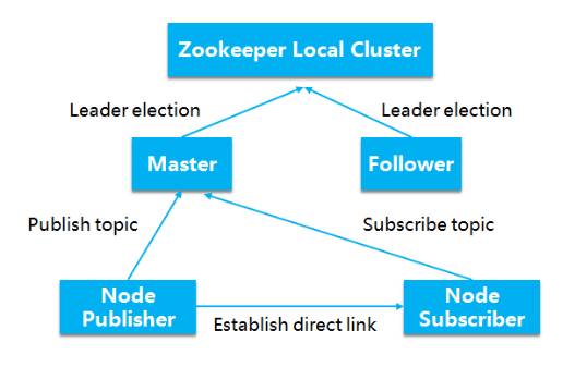 另一个思路是ROS Master 这个关键节点采取备份机制,如果ROS Master 宕机了,备份节点会顶上,可以采用开源的分布式协调框架zookeeper 去完成这个功能,见下图: