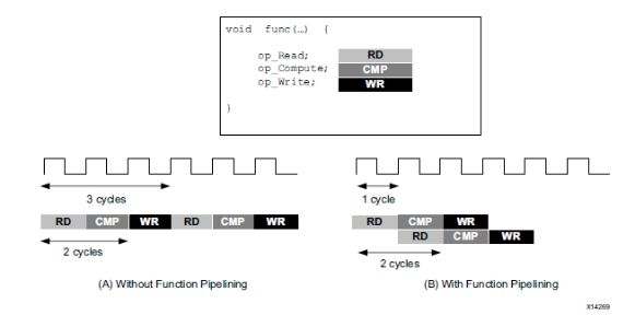 下图A是没有进行Pipeline处理的代码,只有当RD、CMP和WR整个处理过程完成后,才会进行下一组数据的处理,即处理一组数据需要3个时钟周期。图B是进行Pipeline优化后的代码,每个时钟周期都有数据输入并被处理,所以吞吐量是图A的3倍。