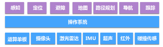感知、定位、避障、地图、路径规划、导航、跟踪是封装的软件算法模块,软件算法与感知单元采集的数据配合,完成机器人的各种功能。
