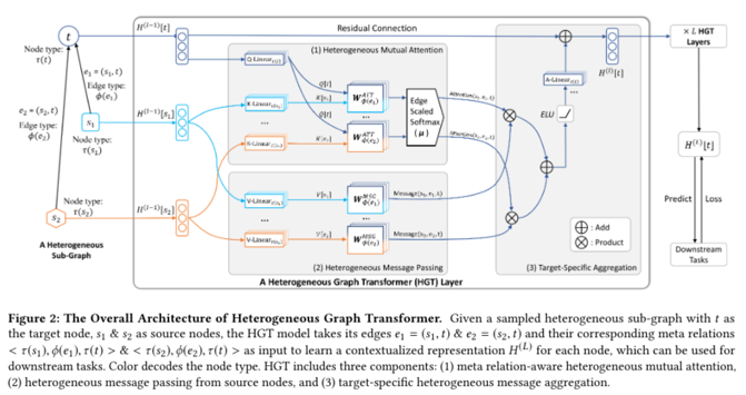 对于左图这样的异构图,可以定义出不同的元关系,每个meta-relation由三部分组成。文中提出相比于R-GCN,HGT的优势在于因为使用了三部分来定义元关系,这使得模型对于出现频次较低的关系的学习能力更强(因为另外两部分出现的频次可能不低)。