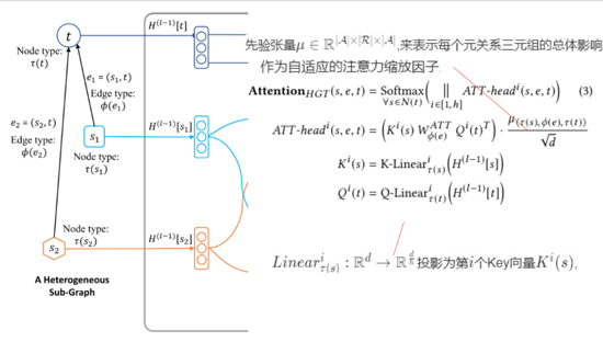 ATT-head表示第i个注意力头;K(s) 代表源节点s投影成的第i个Key向量;Q(t) 代表目标节点t投影成第i个Query向量;μ(·) 表示每个关系三元组的一般意义,作为对注意力自适应缩放;