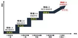 情报更是如此(如图15所示)。 从“一战”时期的人员情报(HUMINT, Human Intelligence),到“二战”时期的信号情报(SIGINT, Signal Intelligence),到“冷战”时期的图像情报(INMINT,Image Intelligence),到“网络战”时期的网络情报(NETINT,Network Intelligence)/开源情报(OSINT,Open Source Intelligence),再往下发展,就是“智能”时期的平行情报(PARINT,Parallel Intelligence)。 怎么智能? 就是平行。