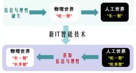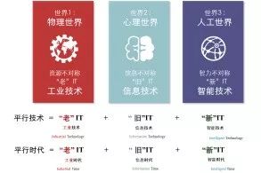 在三个世界中,开发不同的IT,但它们的缩写都是一样的(如图12所示)。 在第一世界即物理世界中,开发的IT是工业技术(Industry Technology),在第二世界即心理世界中,开发的IT是信息技术(Information Technology),在第三世界即人工世界中,开发的IT是智能技术(Intelligent Technology)。