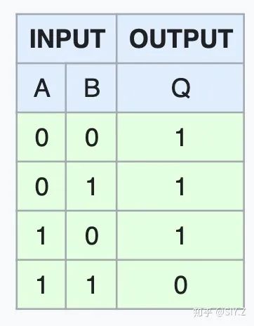 2、经典计算机中任意一个组合逻辑,都可以对应到一个矩阵。这个很显然,由于状态都是单位基向量,所以只要往矩阵对应的位置填上 1,就可以实现所有的功能。比如 NAND 对应的矩阵: 。