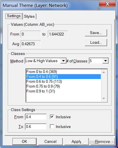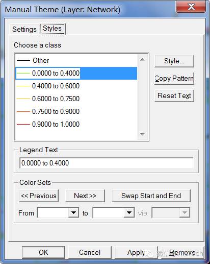 在 Create Themes 选项打勾,在 Max V/C 编辑框输入最大V/C 值,type an interval value 在Interval Size 编辑框输入一个分级值,在下拉菜单选择起始、结束和中间颜色。