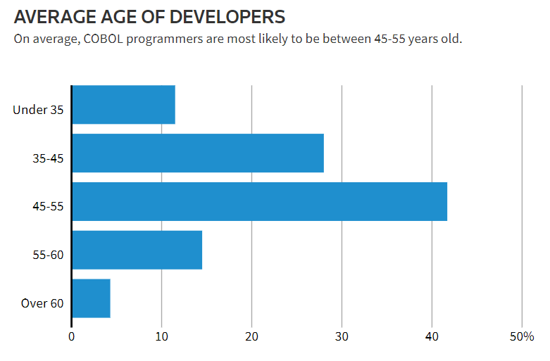 而在COBOL开发人员的平均年龄上,大部分程序员位于45-55岁年龄段,可以说是几乎是「大爷级」了。