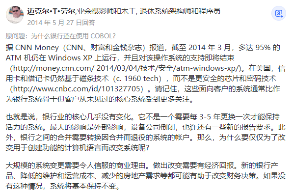 还有人表示,几十年过去,对整个系统进行完全替换和重写的成本太高。既然旧系统仍旧能用,还不如继续维护。
