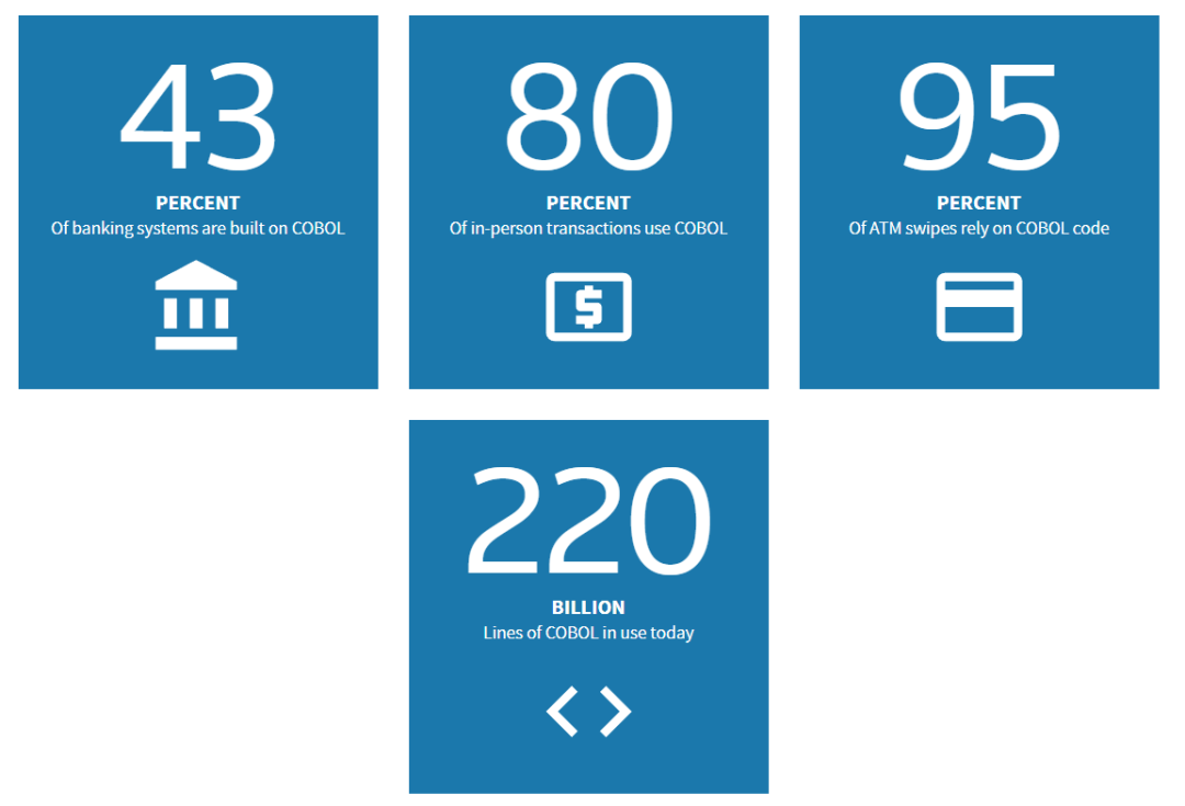 显示,今天仍有 2200 亿行 COBOL 代码正在使用, 43% 的银行系统和 95% 的