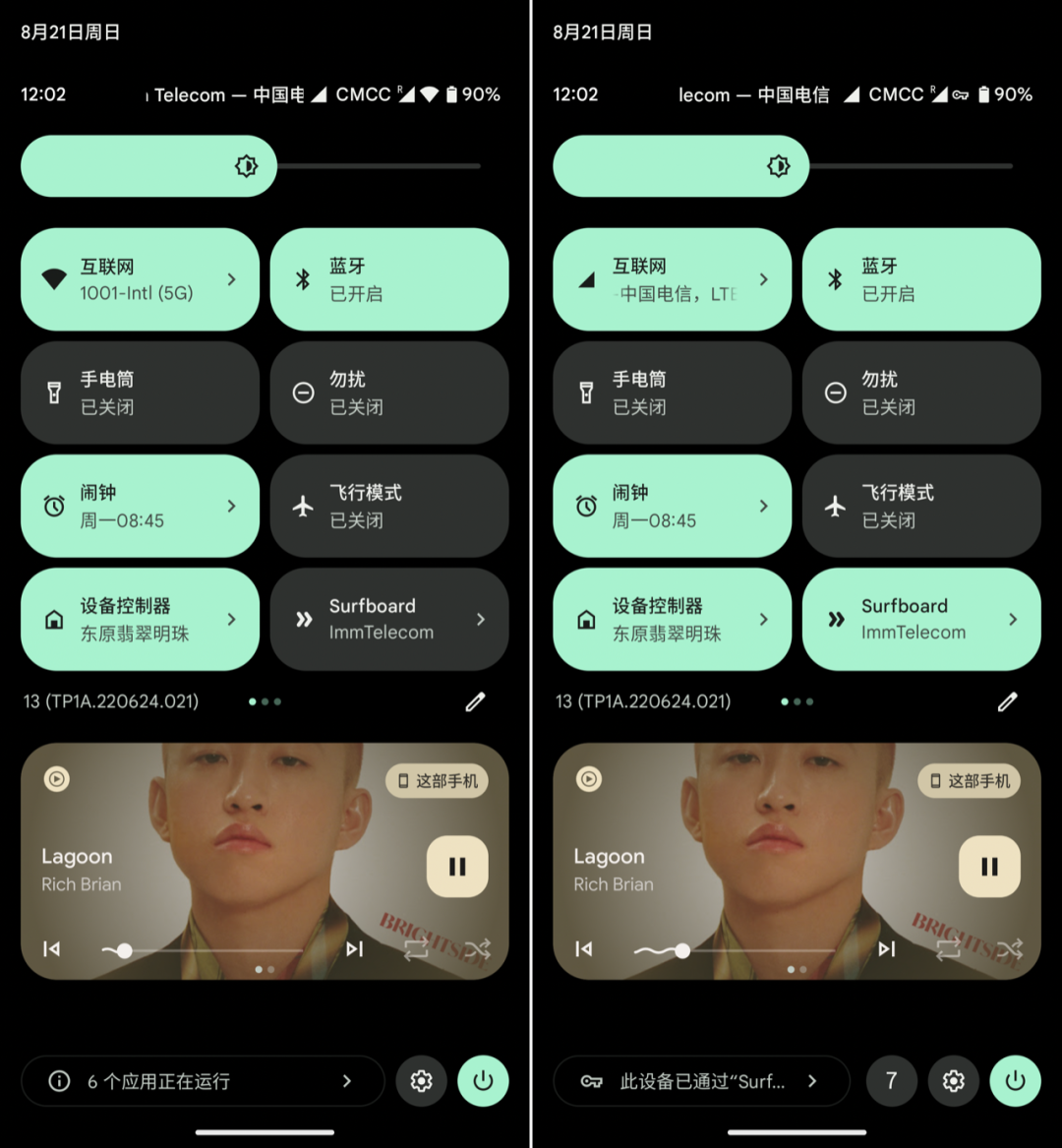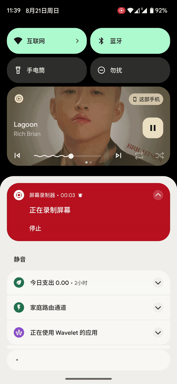 从原理上来说,前台服务与后台管理这两件事是同一枚硬币的两面,Android 13 则为用户带来了对前台服务的检测和停用手段:在快速设置开关面板底部,我们可以看到一栏用于提示当前正在运行前台服务应用数量的新操作区域,在底部被其他提示占用时,这个提示则会变成一个包含数字的气泡按钮。