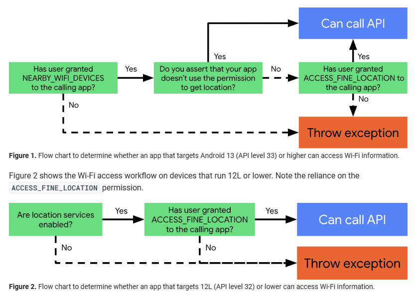 另外,开发者文档中也有几个细节值得玩味:Google 不仅在 Android 13 中限制了设备直接通过本机 Wi-Fi 发信功能(热点、Wi-Fi Direct 等)探测附近设备的能力,还要求应用必须声明自己不会从这些 Wi-Fi 设备信息中推导地址位置信息方可通过此 API 获取授权,即便应用已适配 Android 13。否则开发者必须像未适配 Android 13 的应用一样,只能通过精确地理位置权限来达成目的——而用户对定位权限的授予一般而言是更为谨慎的。