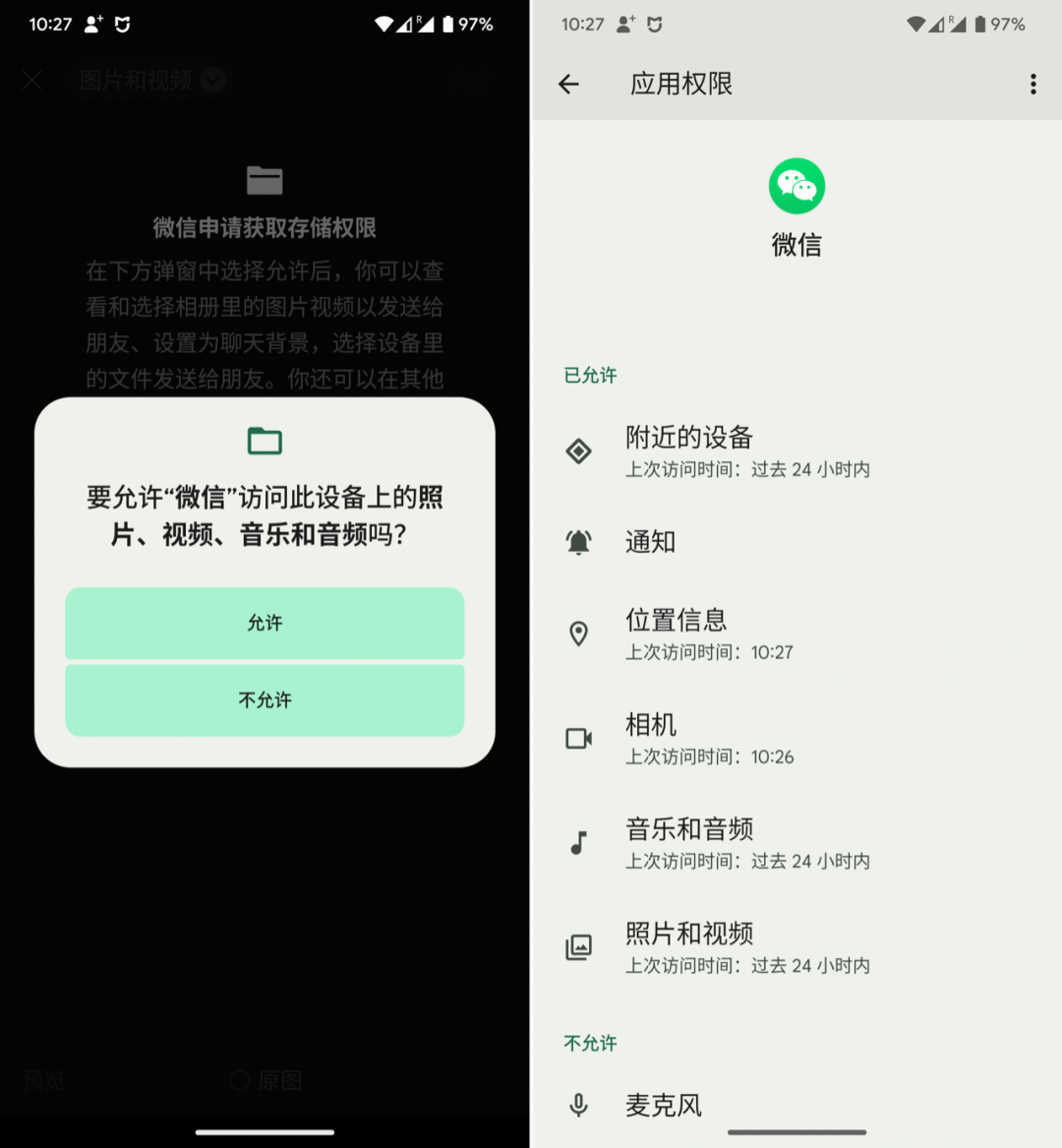 同样以微信为例,如果你安装的是已经适配了 Android 11 的 Play 商店版本,在 Android 13 中,微信的文件访问权限申请以及文件访问权限会变成下面这样: