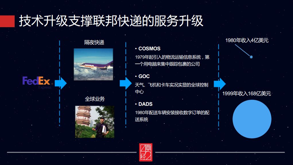 第二个案例是 FedEx(联邦快递),我们发现在 1979 年,他们就开始引入物流运输的信息系统 COSMOS,是第一个用电脑来集中跟踪包裹的公司,并且有实况实显的全球控制中心,1980 年还开始接受数字订单的配送系统。