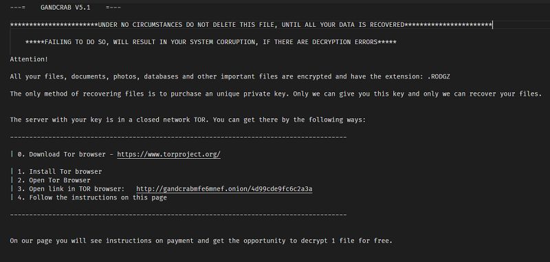 病毒名叫 GANDCRAB,2018年年初出现的,老爸中招的是 V5.1 版变种,更新于2018年12月份。该病毒在每一个被感染的目录中都留了一个 RODGZ-DECRYPT.txt 文件。