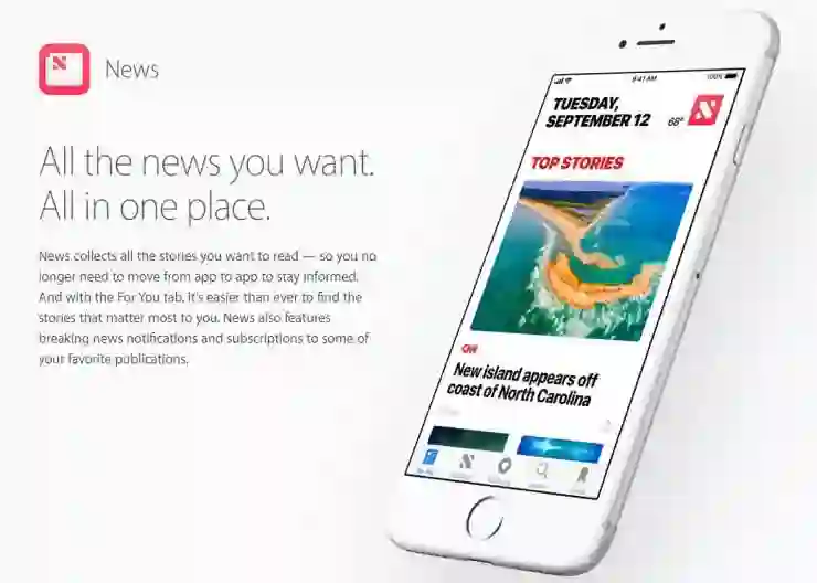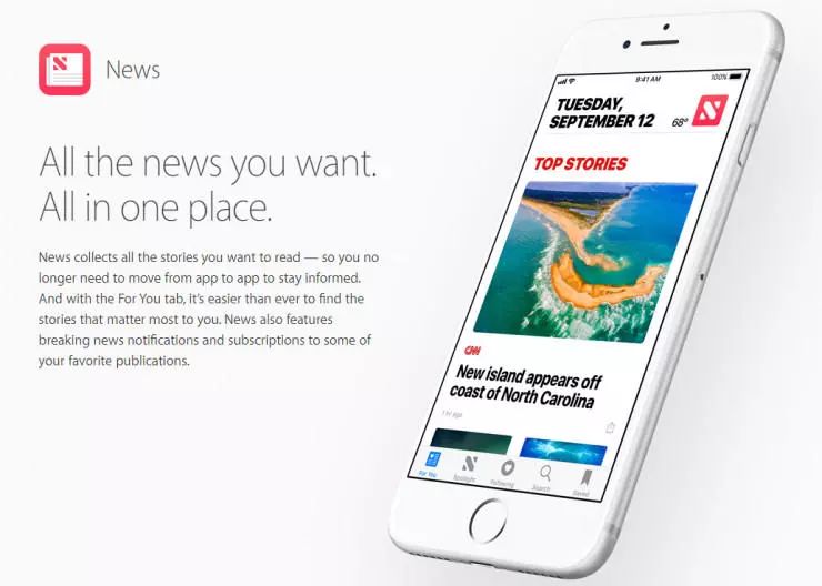 2015 年 9 月 16 日,伴随着 iOS 9 正式版的发布,Apple News 作为一款 iOS 应用在 iPhone、iPad 和 iPod Touch 中正式上线,仅限美国市场;而在随后在 iOS 9.1 版本中,Apple News 又在澳大利亚和英国市场上线。