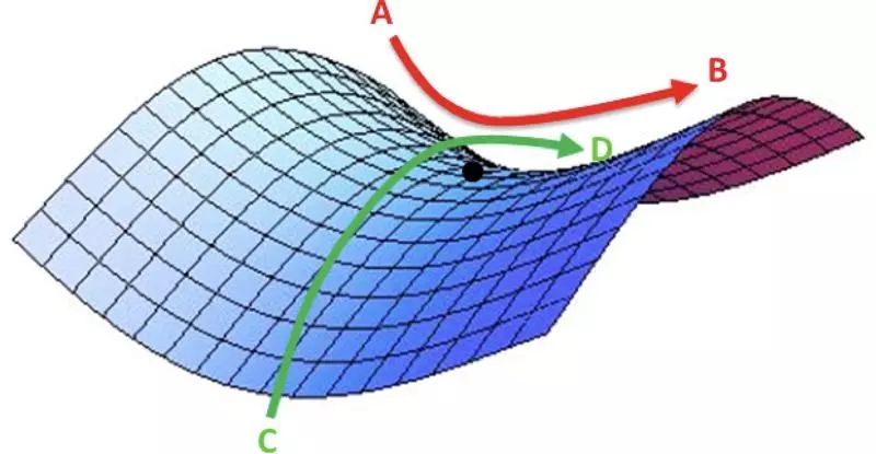 AI 前线:鞍点是梯度接近于 0 的点,在误差曲面中既不是最大值也不是最小值的平滑曲面,则一般结果表现为性能比较差;如果该驻点是局部极小值,那么表现为性能较好,但不是全局最优值。
