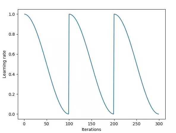 另一种同样受欢迎的方法是由 Loshchilov 和 Hutter 提出的热重启的随机梯度下降法(Stochastic Gradient Descent with Warm Restarts,SGDR)[6]。这种方法主要利用余弦函数作为循环函数,并在每个周期的最大值重新开始学习率。“热重启”一词源于这样的一个事实:当学习率重新开始的时候,并不是从头开始,而是来自模型在上一步收敛的参数开始 [7]。