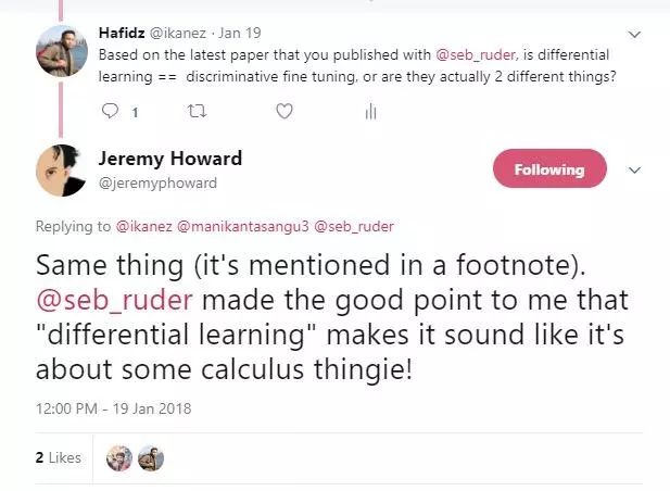 在写这篇文章的时候,Jeremy 和 Sebastian Ruder 发表了一篇论文,深入探讨了这个话题。所以我估计差分学习率现在有一个新的名字:判别式微调(discriminative fine-tuning)。 :)