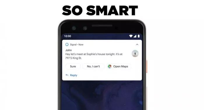 在Android 10中启用了回复通知的全新方式。由于邮件包含一个地址,它允许用户回复几个快速选项或只是用所述地址打开谷歌地图。