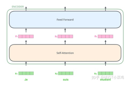 输入的每个单词通过嵌入的方式形成词向量,通过自注意进行编码,然后再送入FFN得出一个层级的编码。