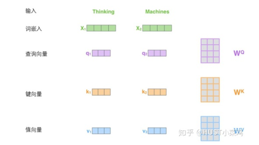 在self-attention中,每个单词有3个不同的向量,它们分别是Query向量,Key向量和Value向量,长度均是64。它们是通过3个不同的权值矩阵由嵌入向量X乘以三个不同的权值矩阵得到,其中三个矩阵的尺寸也是相同的。均是512×64。