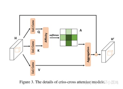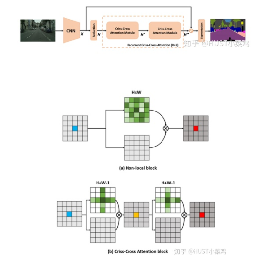 本篇文章的亮点在于用了巧妙的方法减少了参数量。在上面的DANet中,attention map计算的是所有像素与所有像素之间的相似性,空间复杂度为(HxW)x(HxW),而本文采用了criss-cross思想,只计算每个像素与其同行同列即十字上的像素的相似性,通过进行循环(两次相同操作),间接计算到每个像素与每个像素的相似性,将空间复杂度降为(HxW)x(H+W-1)