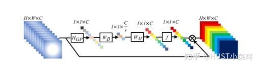 Excitation操作:学习各通道的依赖程度,并根据依赖程度对不同的特征图进行调整,得到最后的输出,需要考察各通道的依赖程度