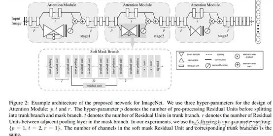 文章中注意力的机制是软注意力基本的加掩码(mask)机制,但是不同的是,这种注意力机制的mask借鉴了残差网络的想法,不只根据当前网络层的信息加上mask,还把上一层的信息传递下来,这样就防止mask之后的信息量过少引起的网络层数不能堆叠很深的问题。