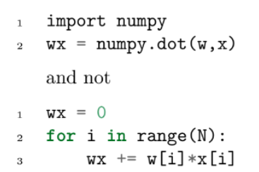 从实用的角度来讲,在实施你的算法时应该尽可能避免遍历。你应该将运算用在矩阵和向量,而不是遍历上。计算 wx 的算法如下: