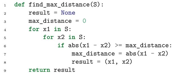例如,假设我们要在大小为 N 的一组示例 S 中寻找两个最遥远的一维示例。我们可以用 Python 写出如下所示的算法来解决这个问题: