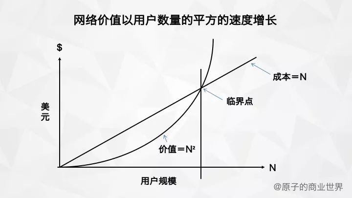 随着网上用户的数量增加(N越大),网络的价值会加速增长,跟N2成正比;而用户获取成本是线性变化的,跟N成正比;达到某一个临界点后,价值将会远远超越成本。
