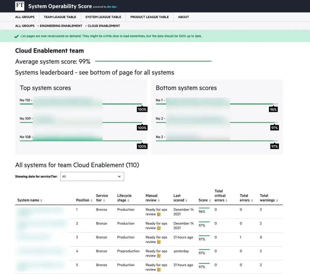 你要尽量让团队都看到各种信息,并用这些信息促使他们做事。我们发现,一旦我们能够向团队展示他们需要改进运营手册的哪些地方,他们就很有可能去做这件事。我们创建了一个带有服务可操作性分数的仪表板,所以团队可以看到他们的工作重点应该在哪里。