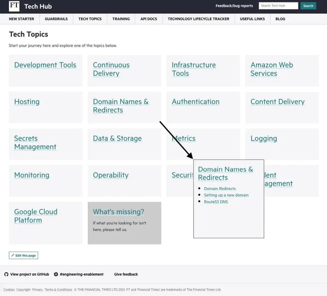 然后,工程师需要做的常规事项应该被记录成文档。总有一些人需要做一些复杂的事情,对此我们的团队有几个 slack 频道和支持这些频道的人手——但对于那 80% 的简单事务来说,文档就应该足够了。最近,我们将工程师的文档合并到了一个 "技术中心(Tech Hub)"。如果你去那里搜索 DNS 关键字,应该就能找到你需要的东西。