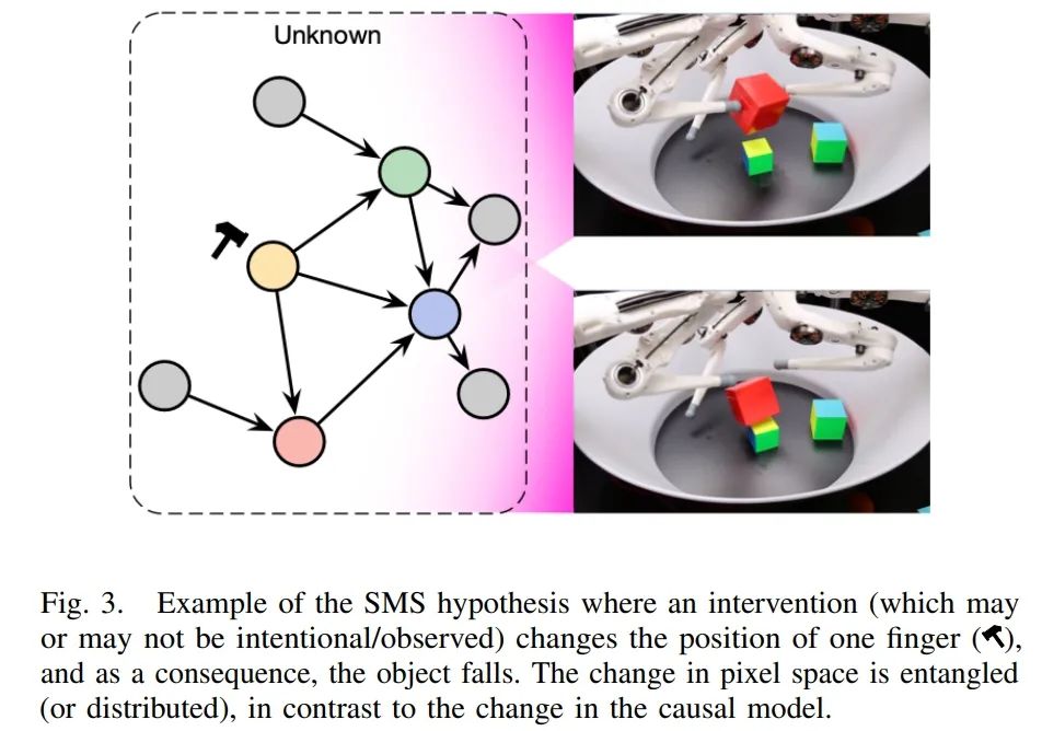 研究者在下图 3 中展示了一个可视化示例,其中恰当因果变量的变化很稀疏(移动手指导致手指和方块位置发生变化),但在像素空间等其他表示中变化则很稠密(手指和方块的移动导致很多像素值发生变化)。