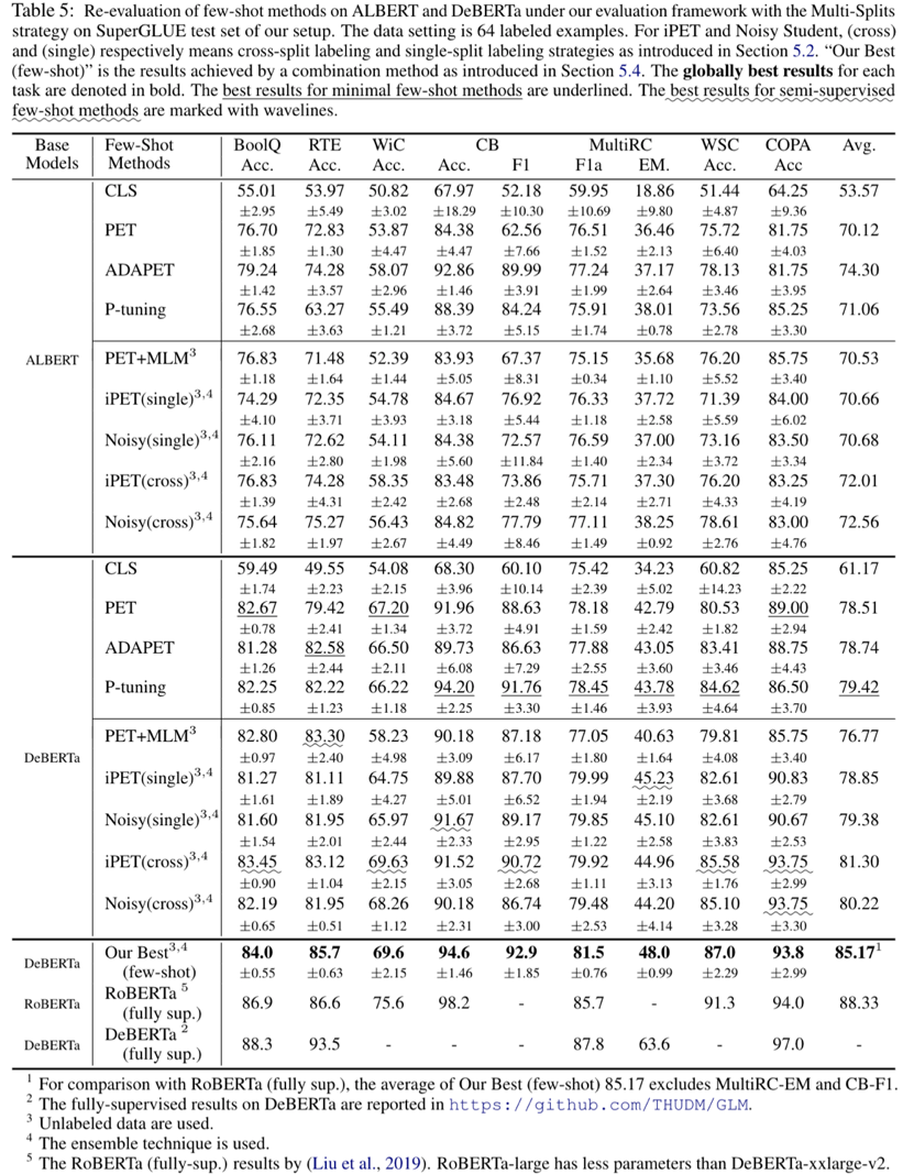 结论1: 小样本学习方法的绝对性能和相对性能差异,和先前相关工作中的结论不同,即在先前文献中未被准确估计。此外小样本方法(例如 ADAPET)在像 DeBERTa 这样的大型模型上的优势会显著降低。半监督少样本方法(例如 iPET和Noisy Student)的增益在较大的模型上也可以保持一致性。