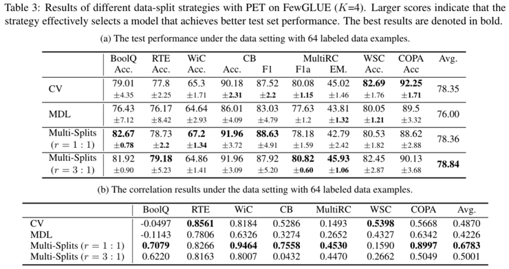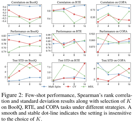 对小样本自然语言评价体系的衡量,我们提出衡量小样本评价体系的关键性指标,分别是:最终测试集小样本学习性能、测试集和验证集关于一个超参数空间分布的相关性、以及稳定性。同时我们以量化实验的方式,对几种候选的评价策略进行比较以论证其有效性。已有实验结果如下,可以看出,多次数据划分(Multi-Splits)是比 K 折交叉验证(CV)和最短描述距离(MDL)更好的数据拆分策略。
