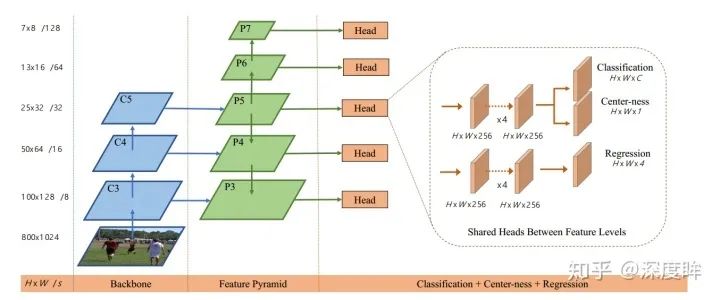 fcos的骨架和neck部分是标准的resnet+fpn结构,和retinanet完全相同。如下所示: