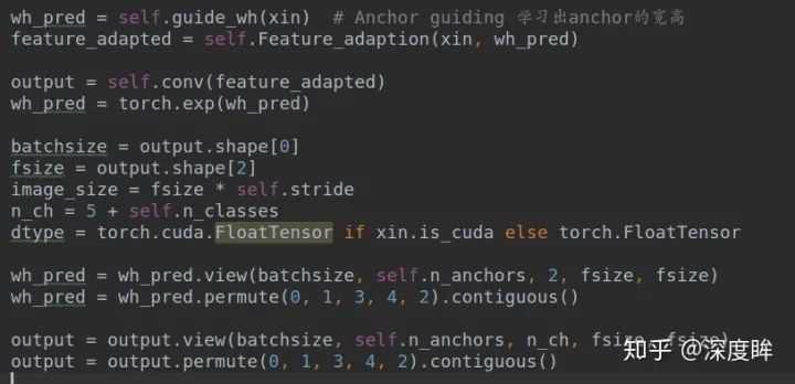 对ASFF层输出的每一层特征图xin,进行GA分支推理,并且经过Feature_adaption,得到最终的bbox预测输出output,由于wh预测肯定是大于0的,故作者采用了exp函数强制大于0.此时就得到了**wh_pred(batch,4,2,h,w)和output(batch,4,5+class,h,w)**。